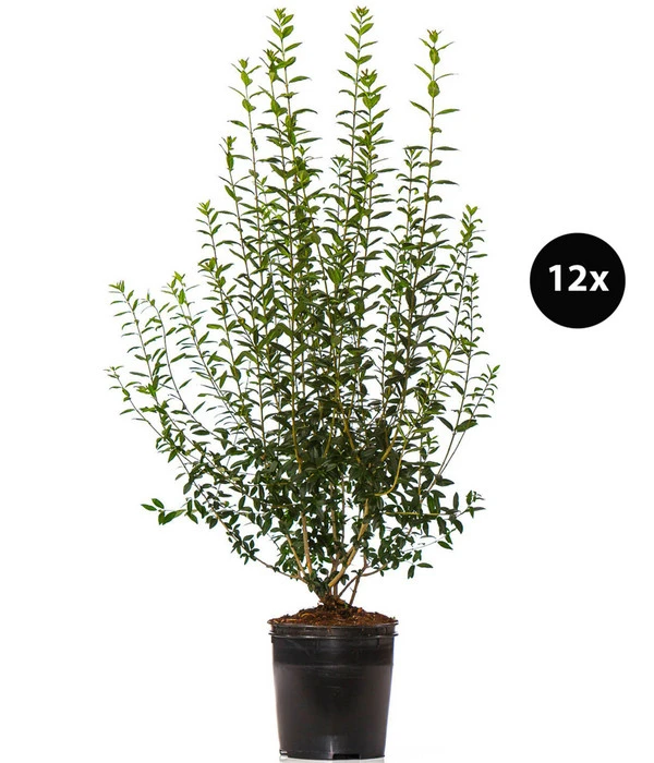 Ein aufrechter und dicht verzweigter Wuchs, eine Fülle grüner Blätter, die die Pflanze freundlicherweise fast das ganze Jahr zur Schau stellt, dazu eine erstaunliche Wuchsfreude und ein wunderbar unkomplizierter Charakter – kein Wunder, dass Ligustrum atrovirens die erste Wahl für alle ist, die eine Hecken mit dem natürlichen Charme eines Laubgehölzes bevorzugen. Mit dem Set 6 Meter Gemeiner Liguster bieten wir Ihnen 12 kräftige, gesunde Pflanzen, die bereits eine stattliche Höhe von 150-175 cm haben, so dass Sie mit ihrer Hecke nicht klein anfangen und deshalb schnell einenwintergrünen Sichtschutz am Garten haben. Wintergrün heißt in diesem Fall, dass die 6 Meter Gemeiner Liguster nicht wie viele andere Gehölze ihr Laub im Herbst abwerfen, sondern den ganzen Winter behalten und sich erst im Frühling zum Neuaustrieb von dem alten Laub trennen. Ziehen Sie mit den 6 Meter Gemeiner Liguster eine wunderschöne, blickdichte Hecke um Ihren Garten und genießen Sie den fast ganzjährigen Blick ins Grüne!