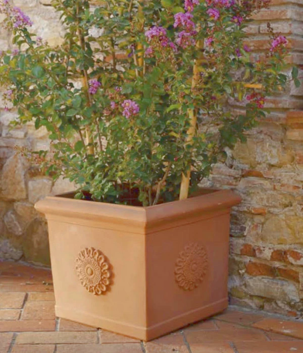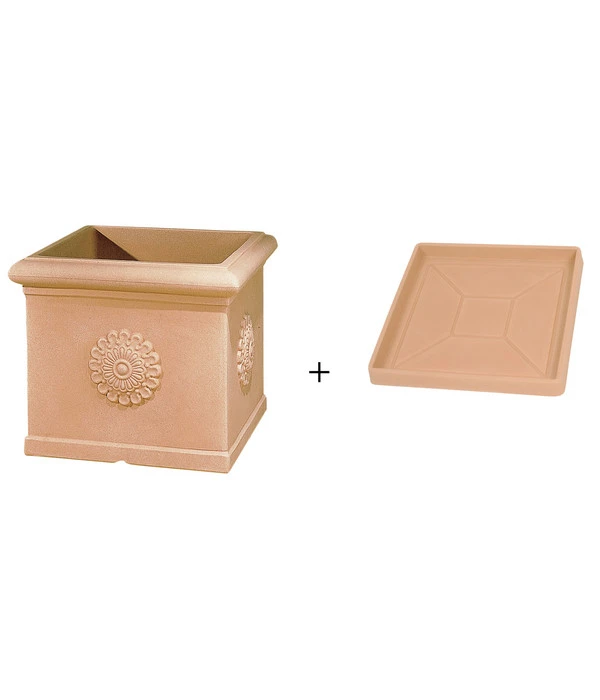 Sie lieben den mediterranen Stil und wollen sich dieses Urlaubsfeeling auch in Ihren Garten holen? Dann wird Sie der quadratische Farmet New Kunststoff-Topf Festonato inkl. Untersetzer bestimmt überzeugen. Seine wunderschönen Ornamente machen das Gefäß zu einem ganz besonderen Blickfang, der auch Ihren Außenbereich aufwerten wird. Dank der schicken Terrakotta-Optik fügt sich der Topf optimal in jedes Ambiente ein und verbreitet eine behagliche Stimmung in Ihrem Garten. Bestücken Sie ihn mit einer Zitruspflanze, einem Olivenbäumchen oder einem Buchsbaum und Sie werden rasch bemerken, dass er Ihre Gewächse ideal in Szene setzt.