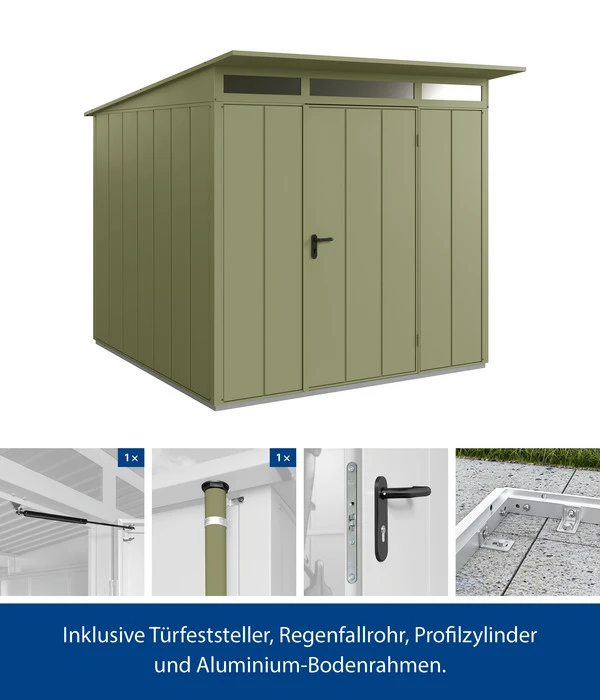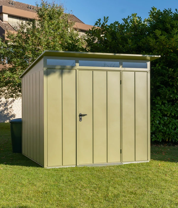Aufbau und Montage des Gerätehauses von Hörmann sind super einfach, sodass Sie schnell in den Genuss der zahlreichen Vorteile Ihres neuen Stauraums kommen. Dazu gehört unter anderem der praktische Lichtausschnitt, welcher im Innenraum für Helligkeit sorgt, sodass Sie auch bei schlechten Lichtverhältnissen alles schnell finden. Ordern Sie den passenden Boden gleich mit, um das Gerätehaus zu schützen und zu stabilisieren. Mit dem Hörmann Berry-Gerätehaus Modern-P Typ 2 haben Sie in Zukunft einen zuverlässigen Platz für all Ihre Gartengeräte. Bestellen Sie jetzt!