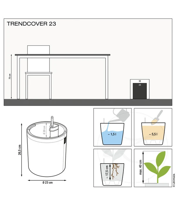 Das TRENDCOVER Cork von LECHUZA begeistert nicht nur optisch, sondern auch durch eine durchdachte Konstruktion. Ein Highlight sind die patentierten versenkbaren Tragegriffe, die den Transport sowie das Umpflanzen deutlich einfacher gestalten. Mit dem Bewässerungsset ist gewährleistet, dass die Zimmerpflanze regelmäßig mit Flüssigkeit versorgt wird. Außerdem sehen Sie auf einen Blick, ob Sie wieder einmal gießen sollten. Abgerundet wird das Produkt von der bewährten hervorragenden Markenqualität von LECHUZA, sodass Sie lange Ihre Freude daran haben können. Bestellen Sie das praktische All-in-One-Set inkl. Pflanzeinsatz und Trendcover-Hülle noch heute.