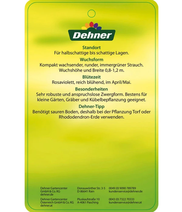 Als Moorbeet-Pflanze bevorzugt der Rhododendron ‘P.J. Mezitt‘ einen frischen bis feuchten, durchlässigen, humosen und vor allem sauren Boden, idealerweise mit einem pH-Wert zwischen 4,5 und 5,5. Entspricht Ihr Gartenboden diesen Werten nicht, geben Sie gleich bei der Pflanzung spezielle Rhododendronerde mit ins Pflanzloch. Der Standort sollte sonnig bis halbschattig sein, wir empfehlen Ihnen aber, im Winter die Blätter bei starker Sonnenstrahlung mit einem Vlies zu schützen. Frosttemperaturen machen dem ‘P.J. Mezitt‘ aber nichts aus. Und denken Sie daran: Während der Blüte ist der Strauch recht durstig.