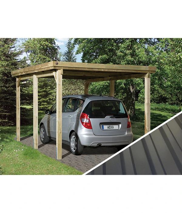 Innen haben die Pfosten einen Abstand von 181 cm zueinander, sodass Sie problemlos Ihren Pkw unterstellen können. Doch der Weka Carport Stahldach lässt noch vielfältige weitere Nutzungsmöglichkeiten zu. Stellen Sie Ihre Gartengeräte, wie beispielsweise den Rasenmäher, eine Laubharke, die Schubkarre oder den Spaten, unter. Auch Motorräder, Fahrräder und das Bobby-Car Ihres Kindes fühlen sich im Carport wohl und sind geschützt. Ihrer Kreativität sind keine Grenzen gesetzt. Der Aufbau geht leicht von der Hand und dauert nicht lange. Bestellen Sie jetzt diesen schönen und praktischen Carport von Weka und ordern Sie das notwendige Zubehör und Dekorationen am besten gleich mit!