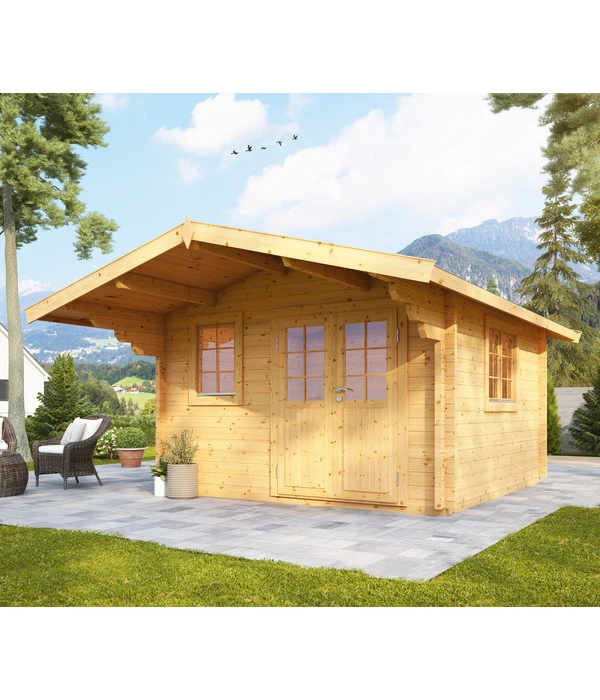 Dank der verglasten Doppeltüre und den Fenstern steht Ihnen ein lichtdurchfluteter Naturraum zur Verfügung, der zur Einrichtung einer gemütlichen Gartenlaube einlädt. Das unbehandelte Fichtenholz strömt einen herrlichen Duft aus und bringt noch ein Stück Natur mehr in Ihren Garten. Natürlich bietet sich Ihnen auch die Möglichkeit, das Gartenhaus Nordkap optisch ganz an Ihre Bedürfnisse anzupassen. Egal, ob in rot gestrichen im Schwedenstil, stylisch modern in grau und weiß oder naturbelassen – hier sind Ihrer Kreativität keine Grenzen gesetzt. Und wenn es draußen etwas ungemütlicher wird, sorgen die hohe Wandstärke und die innenliegenden Gewindestangen für eine zusätzliche Windsicherung und lassen Sie dadurch ganz entspannt bleiben – selbst im Winter. Holen Sie sich jetzt ein Stück Urlaub in Ihren Garten!