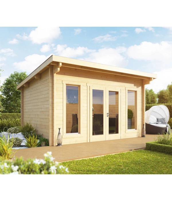 Die Wandbohlen sind beim Wolff Finnhaus Gartenhaus Trondheim 70-A aus naturbelassenem, Nordischem Nadelholz und für eine einfache Montage maßgenau gesägt, während eine spezielle Montageart die wind- und regendichte Verbindung in den Ecken gewährleistet. Ergänzt werden die Wände von 20 mm Dachbrettern und 28 mm Fußbodenbohlen. Die doppelflügelige Tür besteht aus hochwertigem Leimholz, alle Glaselemente sind isolierverglast. Die beiden bodentiefen Fenster haben einen Dreh-/Kipp-Beschlag, die Tür wird inkl. Zylinderschloss geliefert. Hinweis: Da sich aufgrund der geringen Dachneigung keine Abdeckung mit klassischen Schindeln anbietet, empfehlen wir Ihnen, gleich die selbstklebende Dachbahn mit zu bestellen, um das Holzhaus sicher vor dem Eindringen von Feuchtigkeit zu schützen.